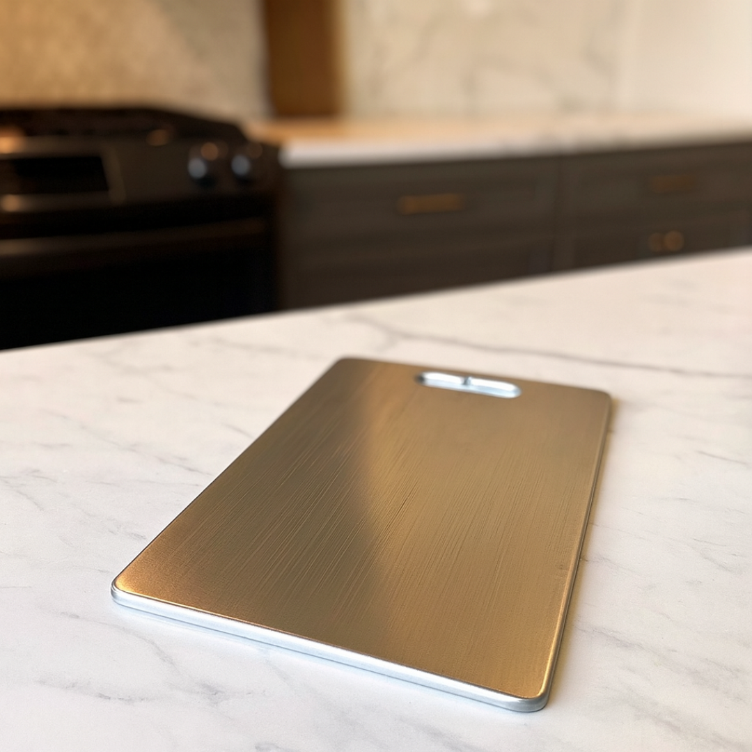 Titan Cut is made from medical-grade titanium, a non-porous and antimicrobial material that resists bacteria, odours, and stains. Unlike wooden or plastic boards, it won’t crack, warp, or absorb food juices — giving you a cleaner, safer surface every time.