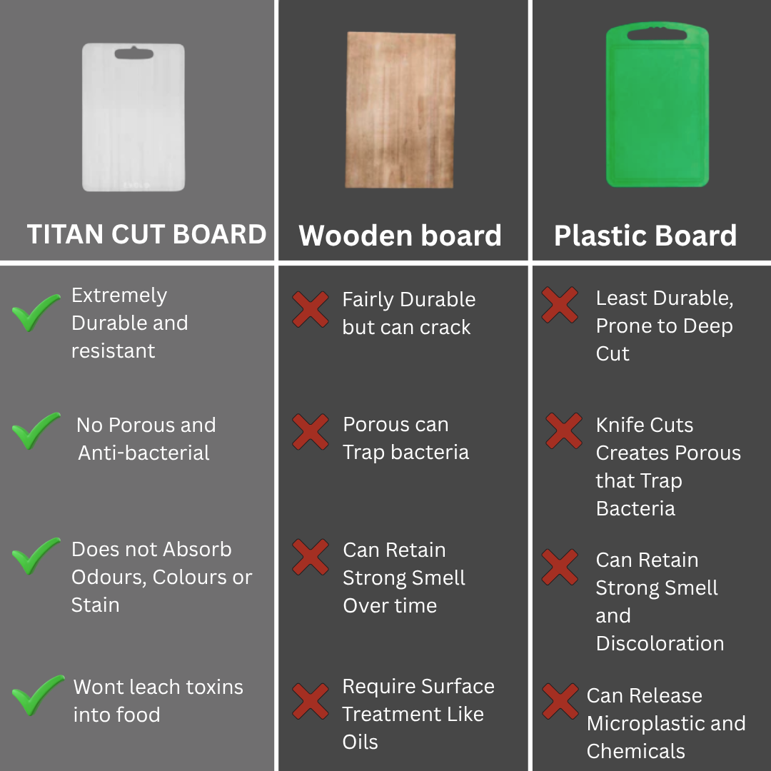 Unlike wooden and plastic boards that harbour germs and trap odours, Titan Cut Chopping Board stays completely hygienic with its non-porous, antimicrobial titanium surface. Built to last a lifetime, it won’t crack, stain, or absorb bacteria, giving you a cleaner, safer way to prepare every meal. Choose our titanium chopping board and keep your family’s health protected.